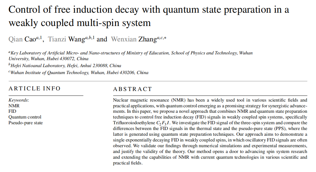 依托量旋三角座,武汉大学团队完成研究《Control of free induction decay with quantum state preparation in a weakly coupled multi-spin system》(arXiv:2309.00793v1),核心成果如下: