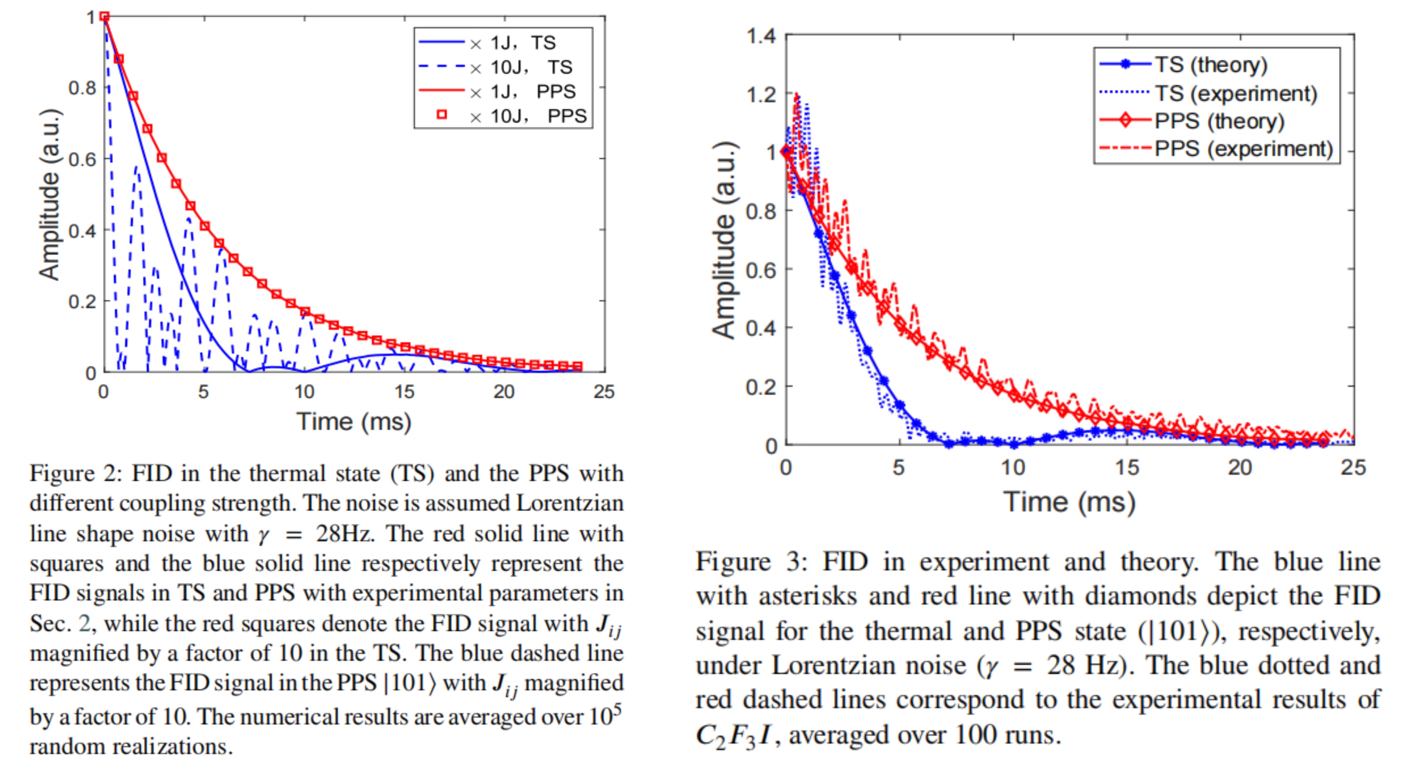 传统 NMR 实验中,弱耦合多自旋系统的 FID 信号因自旋耦合(J - 耦合)常呈振荡特性,偏离理想单指数衰减。团队提出利用量子控制制备 PPS 的解决方案,理论上可抵消 J 耦合调制,使 FID 信号回归 “仅噪声主导的单指数衰减”。