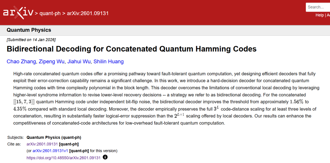 本次研究针对级联量子汉明码这一经典量子纠错编码构造,原创性提出硬判决双向解码算法,从底层机制上突破了传统单向解码的性能局限,核心技术创新与成果如下: