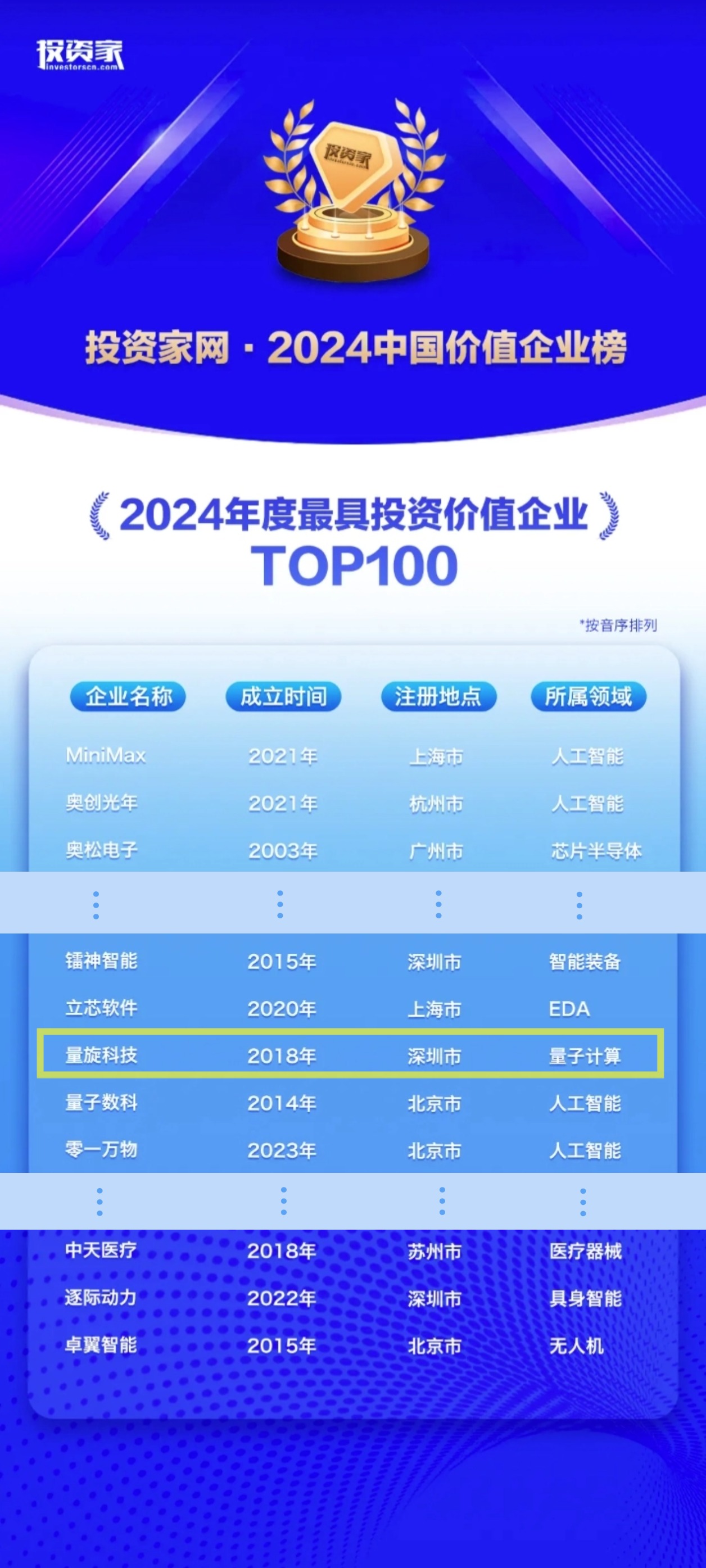 近日,新经济时代下创新企业成长的观察者,投资家网旗下投资家研究院正式揭晓了“投资家网·2024中国价值企业榜”,挖掘出对中国经济未来具有深远意义的创新企业。中国量子科技创新企业量旋科技脱颖而出,入选“2024年度最具投资价值企业TOP100”榜单,彰显出在量子计算领域的深厚潜力与投资价值。