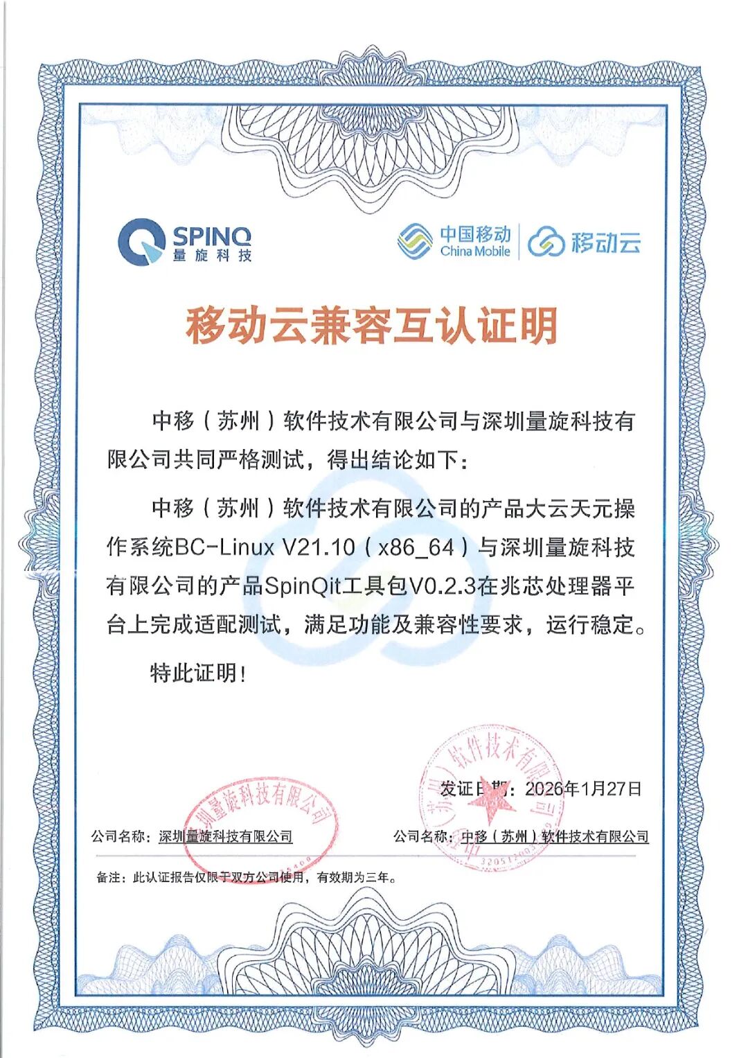 双向适配 生态共赢|量旋科技与移动云完成产品兼容互认